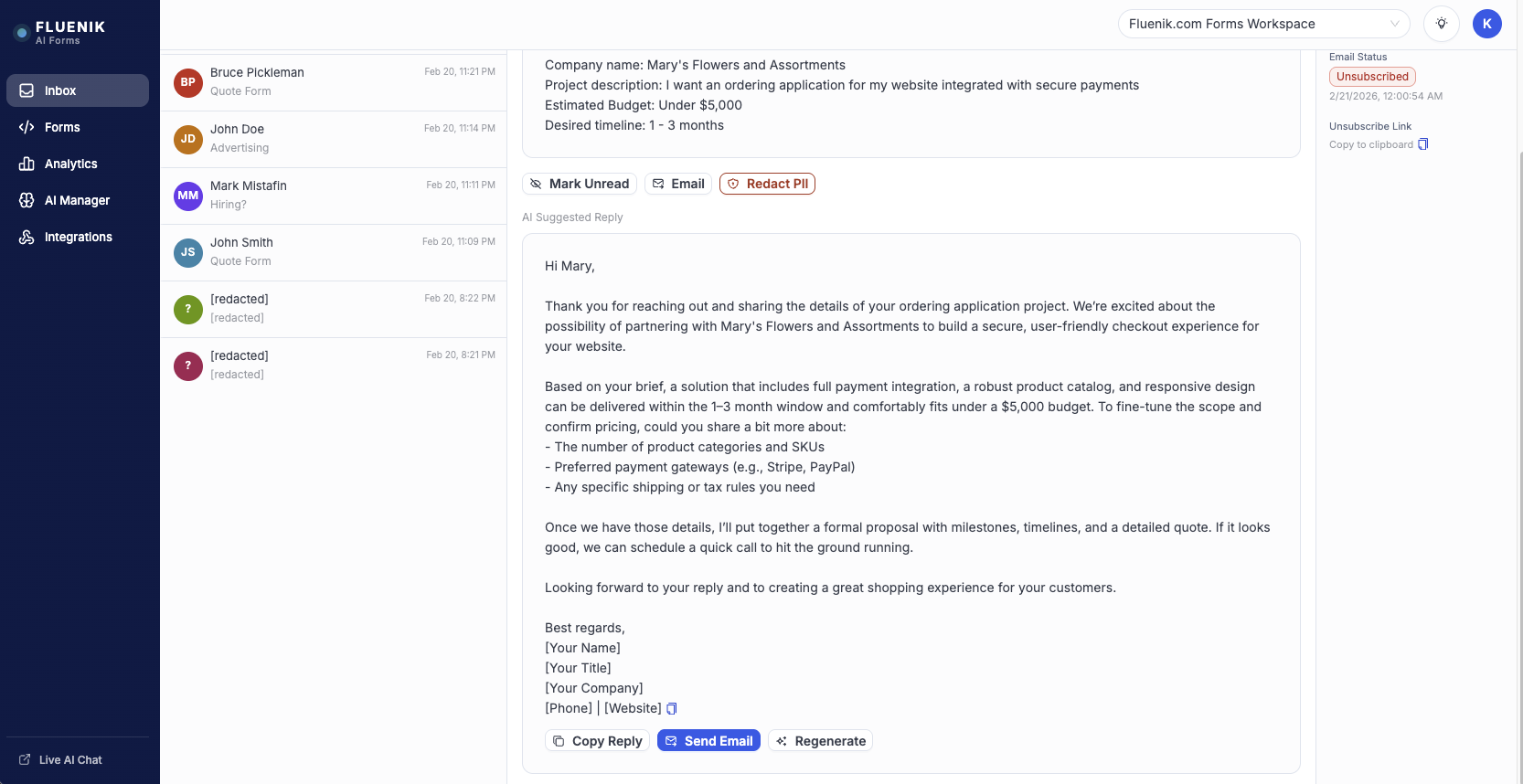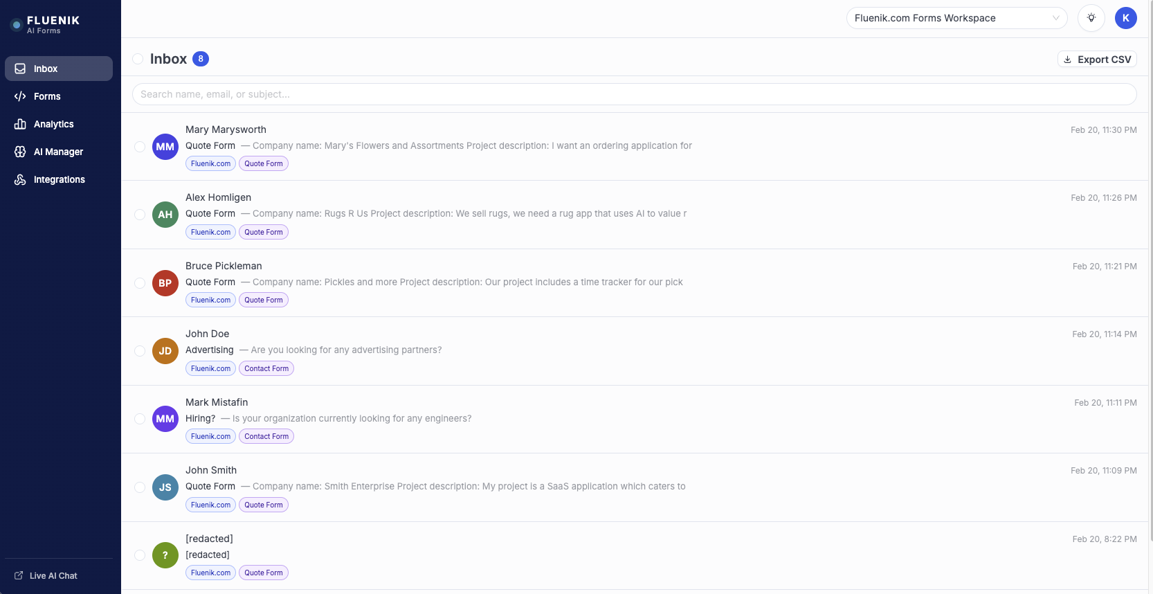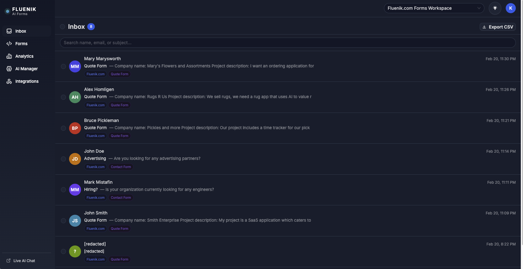 Fluenik AI Forms brings form collection, submission management, and AI-assisted response into a single platform. Teams can deploy branded, embeddable forms on any site and respond to submissions faster using AI tooling that is trained on their own content.