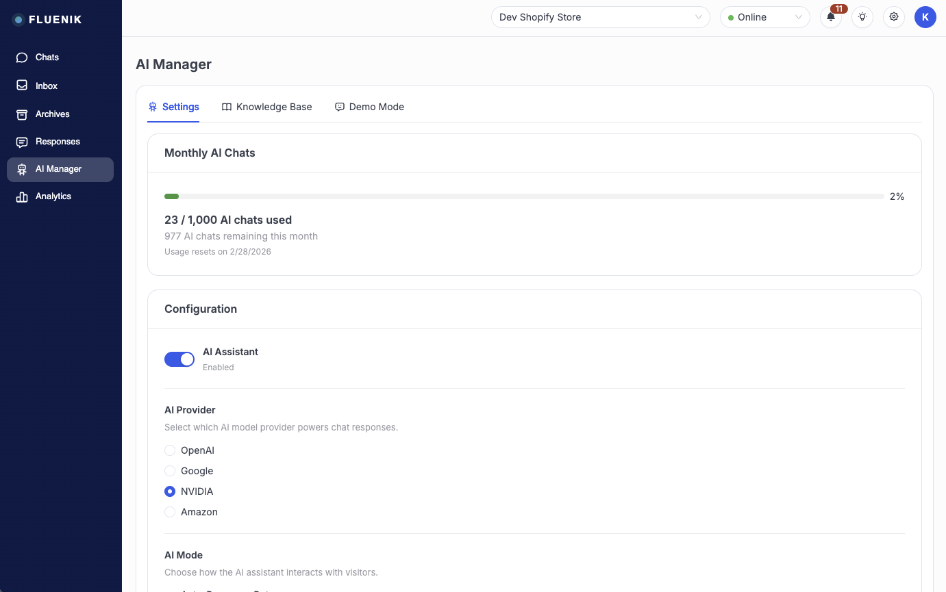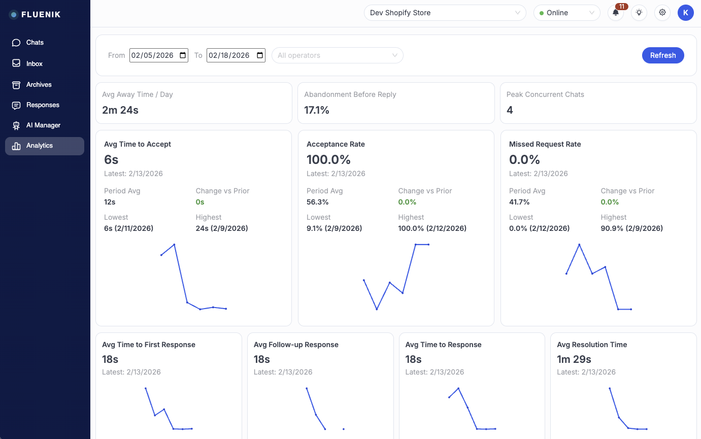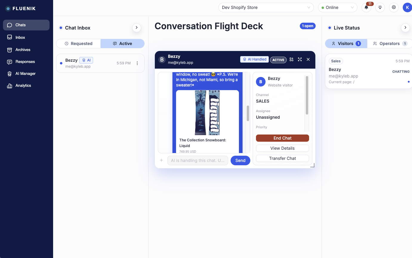 Fluenik Live AI Chat combines realtime support operations with AI tooling in a way that remains practical for support teams. Merchants get faster response handling, stronger storefront context in conversations, and a branded chat experience that fits their business.
