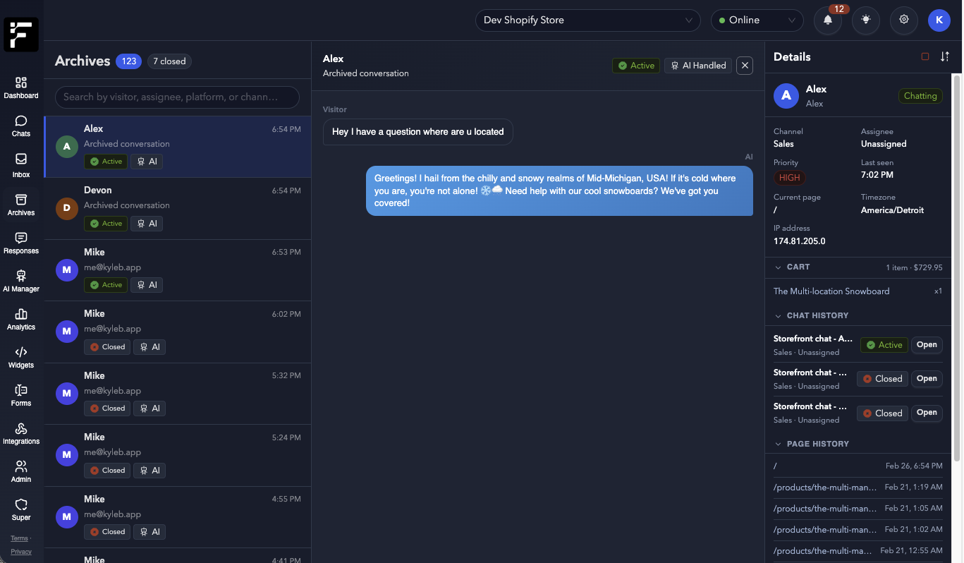- analytics dashboard tracking conversation volume, AI usage, and resolution rates